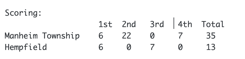 Manheim Township: TDs: Darius Dixon 2, Marcos Fernandez, Jack Kenneff, Allan Feliciano