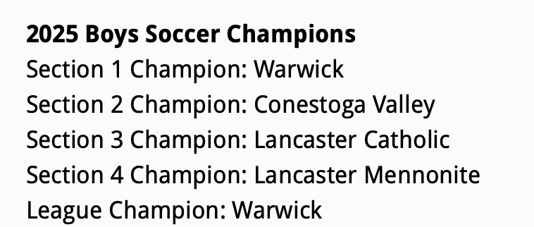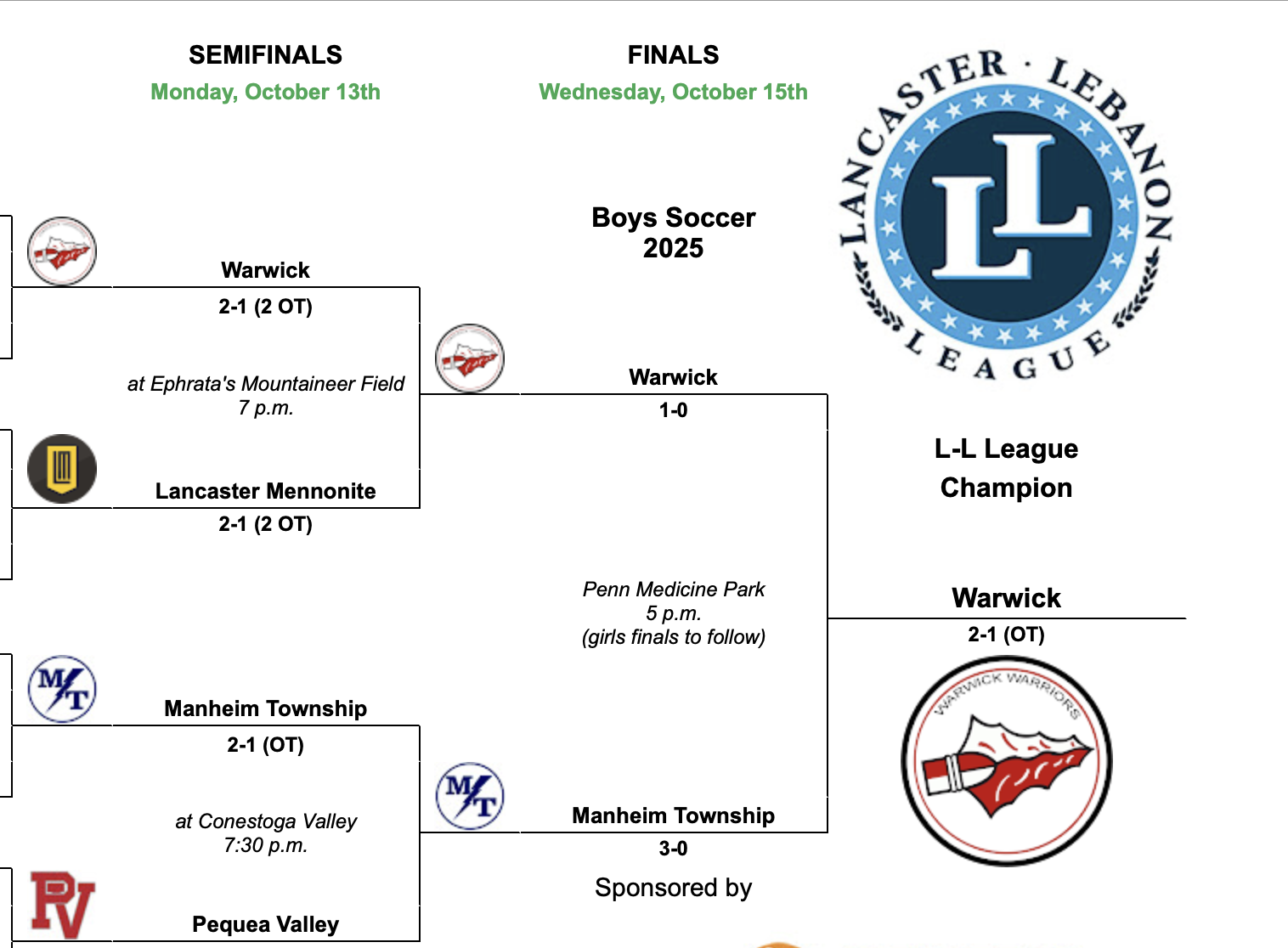 Path to a Title: Warwick (Section 1 Champs) beat Elco (Section 3 runners up) 2-1 in 2OT in the League Quarterfinals! Then beat Lancaster Mennonite (Section 4 Champs) 1-0 in the League Semifinals before topping Township 2-1 in OT in the League Finals.
