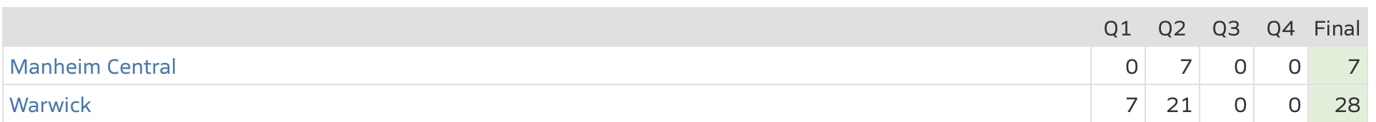 Warwick: Schnipke 2 TDS: 78-yard run and 1-yard run, Koen Adams 60-yard interception TD, Tyler Muster 27-yard pass from Thomas Meyers. All 4 PAT kicks by Tyler Schoffstall.