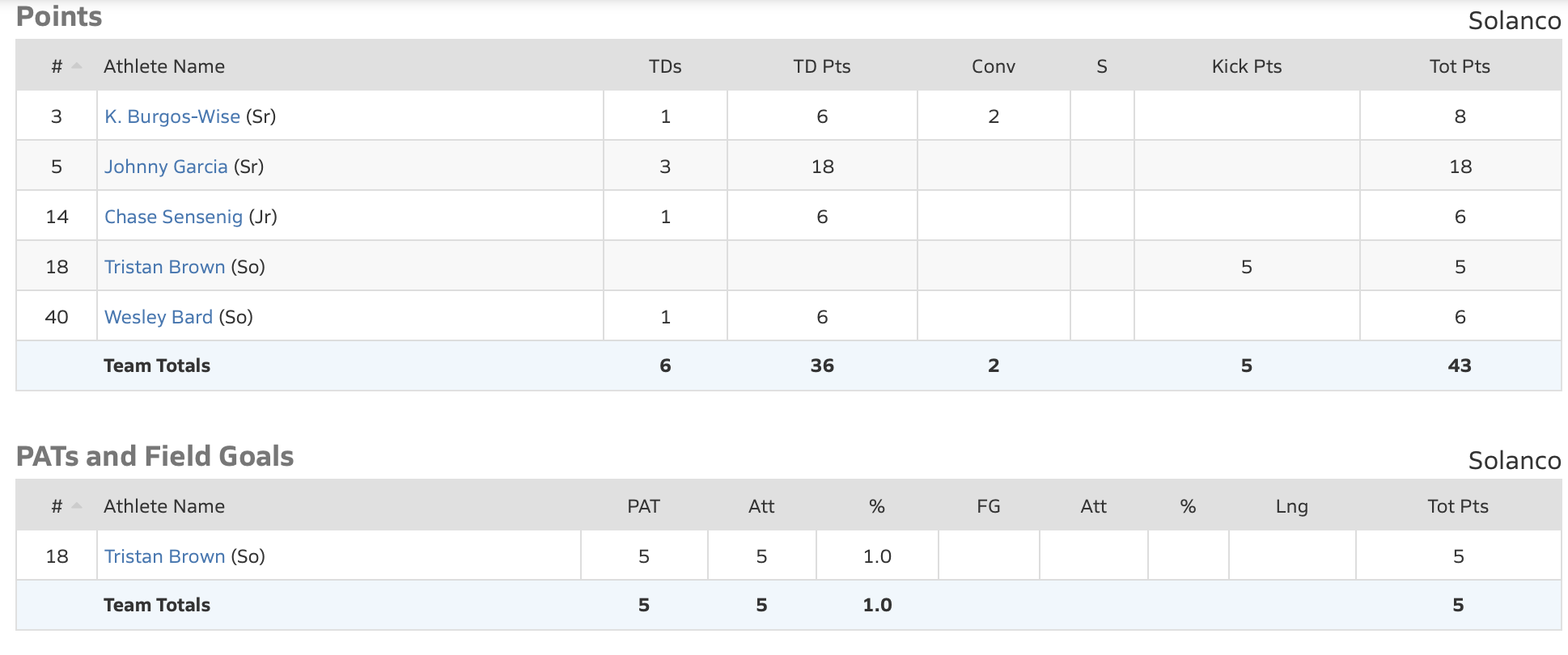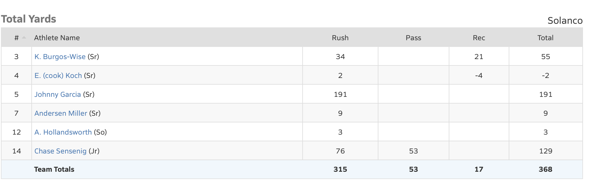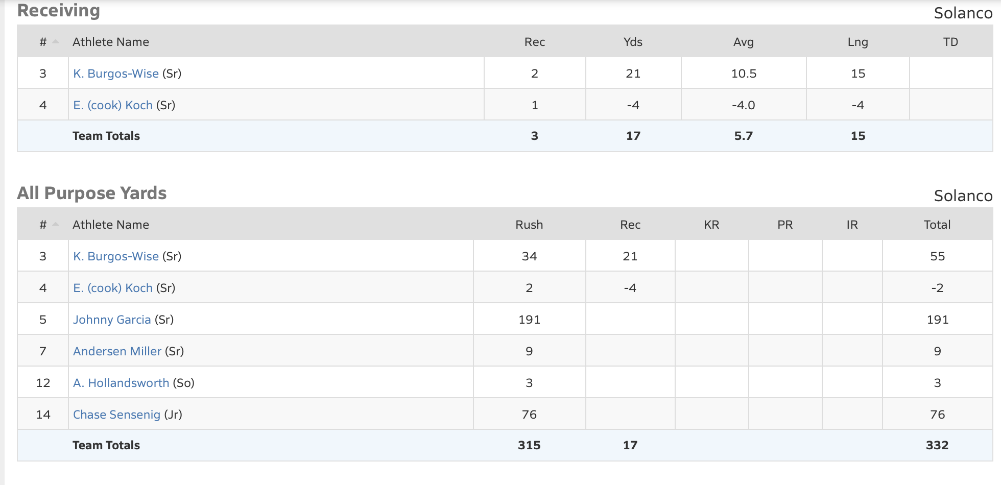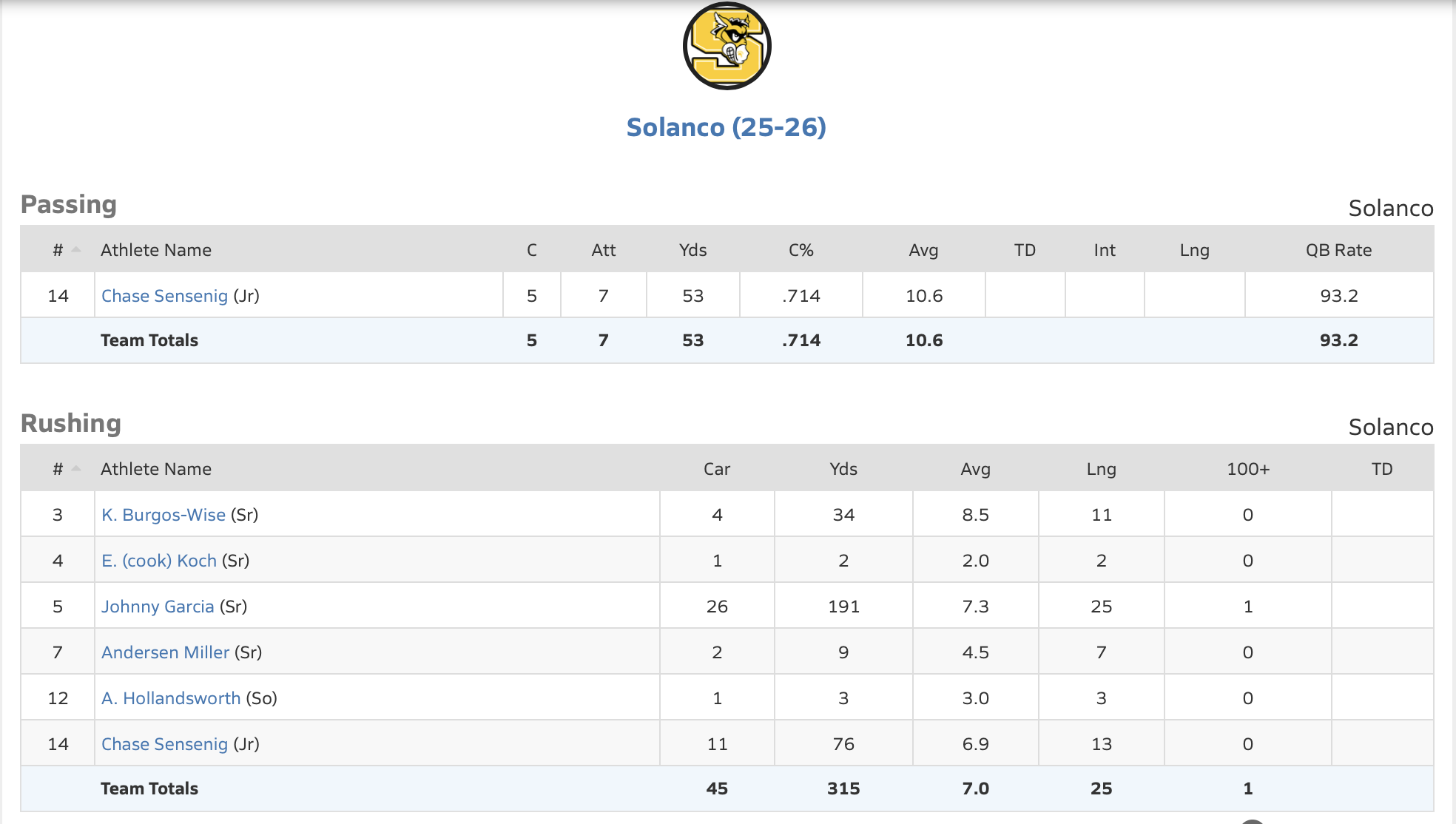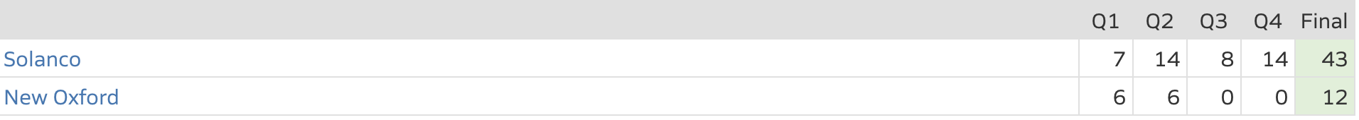 It was a tight game for the whole first half with Solanco leading just 14-12 at the 2:40 mark. The Mules scored in the final minute of the first half (0:25) on a 1-yard TD plunge by Garcia and never looked back in the second half.