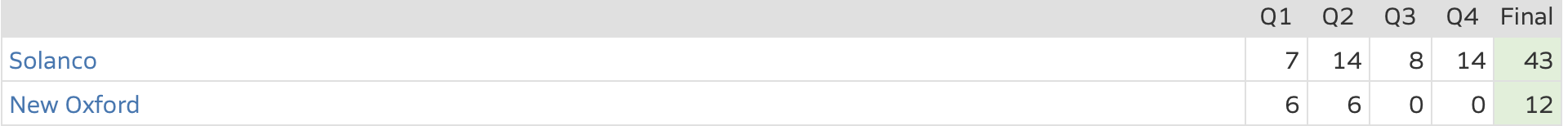 The victory (which was Solanco’s 11th in a row) raised their record to 11-1. The wins came thanks in part to their defensive effort, having only surrendered 13.2 points on average over those games. As for New Oxford, their loss was their first of the season and also makes their record 11-1.