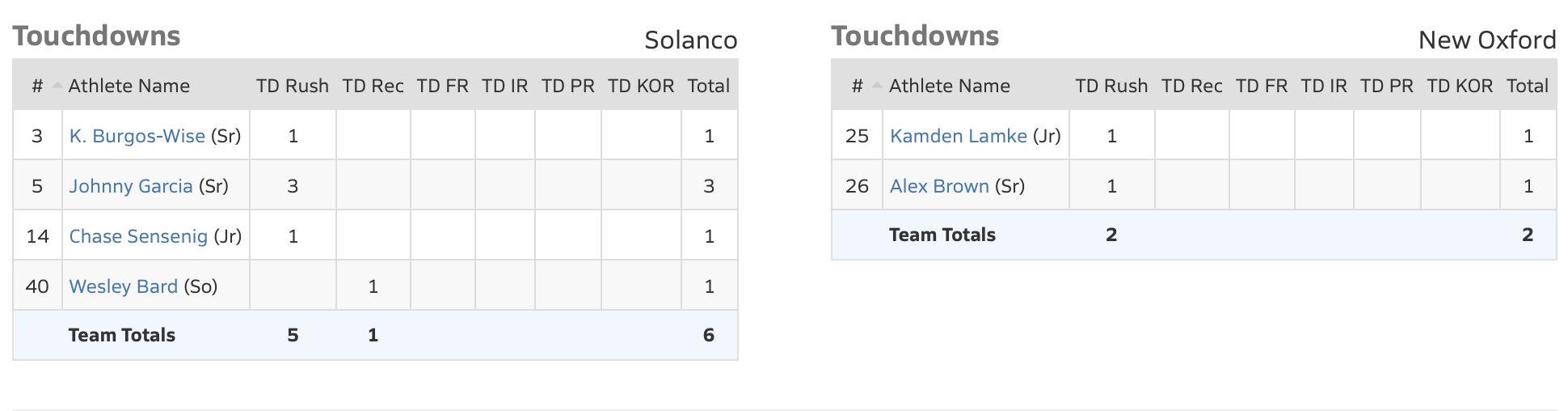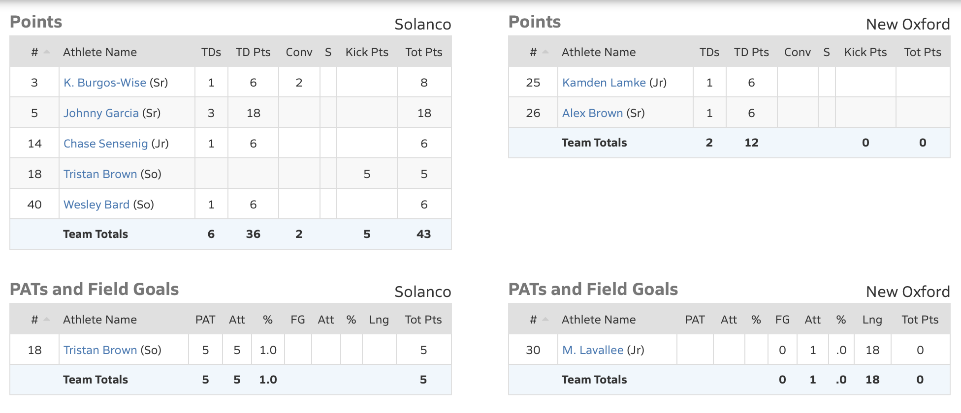 They were just one part of a punishing run game: Solanco was unstoppable on the ground and finished the game with 345 rushing yards. They easily outclassed their opponents in that department as New Oxford only rushed for 125.
