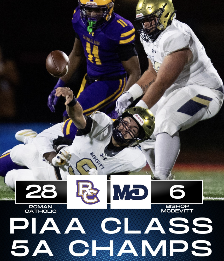 Congrats to head coach Rick Prete (7th season) and the Roman Catholic High School football team from the Philadelphia Catholic League as the Cahillites beat Central Pennsylvania powerhouse Bishop McDevitt from Harrisburg, 28-6 in the PIAA 5A state championship game Friday night @ Cumberland Valley High School in Mechanicsburg.