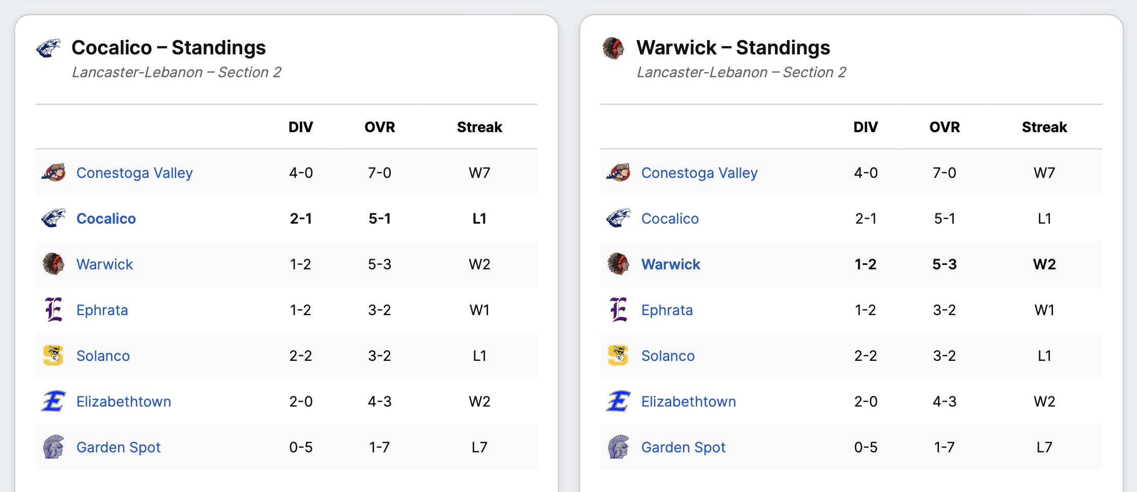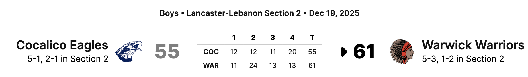 Warwick (5-3 Overall, 1-2 in Section 2) handed Cocalico (5-1 Overall, 2-1 in Section 2) their first loss of the season as the Warriors won a key Section 2 matchup 61-55! Super-Sophomore Austin Clemens led Warwick with 17 points (7-9 FG)… Tyler Musser added 12pts & Ya’Majesty Washington had 11! Cocalico’s Timmy Hambright recorded a New Career-High 34 points (4 – 11 3pt FG) in the loss, with 12 of those coming in a 4th quarter comeback attempt! Karter Deering chipped in 10pts.