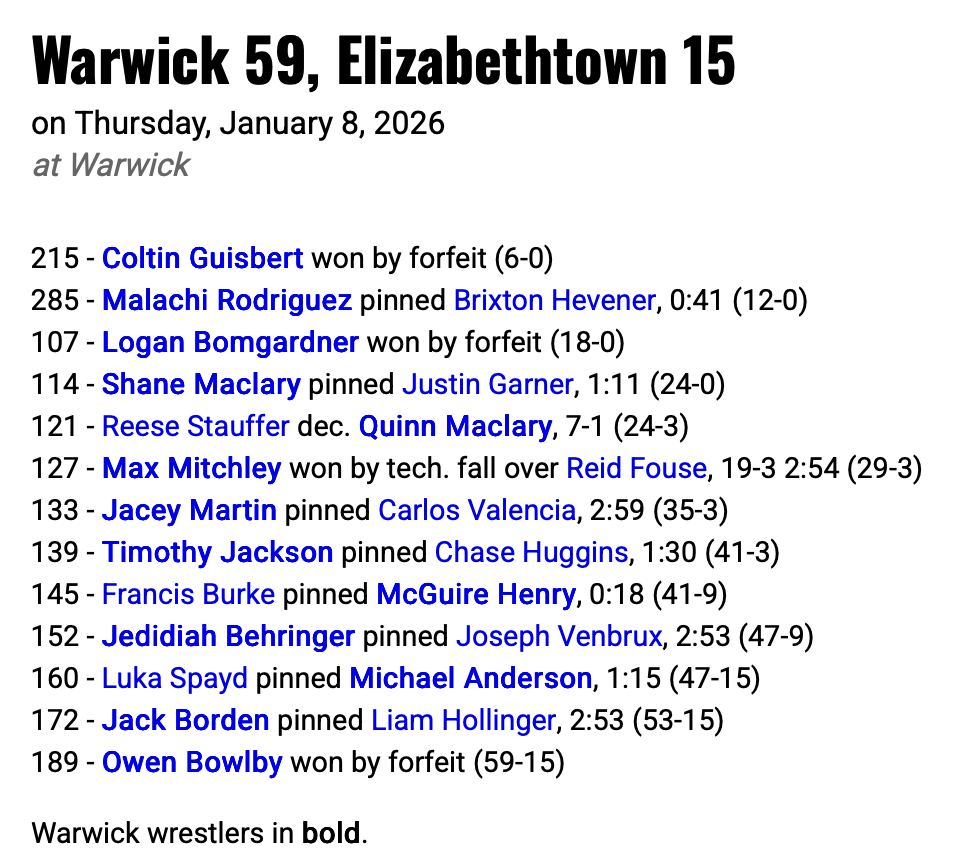 On Senior Night, Warwick rolled to a 59-15 victory over Elizabethtown! Seniors Malachi Rodriguez (285) & Jed Behringer (152) picked up pins… as did teammates Shane Maclary (114), Jacey Martin (133), Tim Jackson (139) & Jack Borden (172)! Etown’s Francis Burke (145) & Luka Spayd (160) also earned pins.