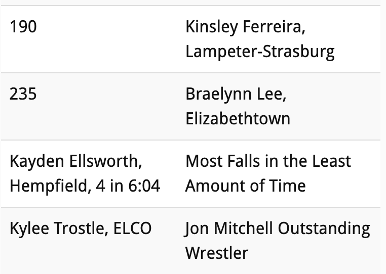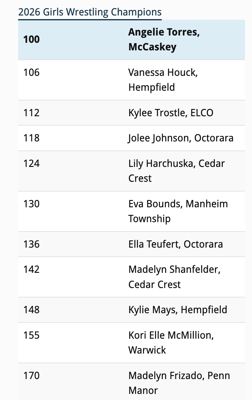 It took Elco’s Kylee Trostle p18 seconds to pin Elizabethtown’s Cassidy Carl for the 112-pound title.