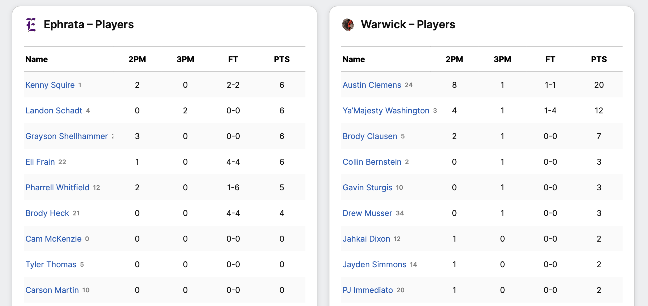 A 10–0 first-quarter run set the tone as Austin Clemens led all scorers with 24 points and Ya’ Majesty Washington added 12. With Elizabethtown also winning, Warwick heads to E-Town Friday in a big Section Two showdown for second place.