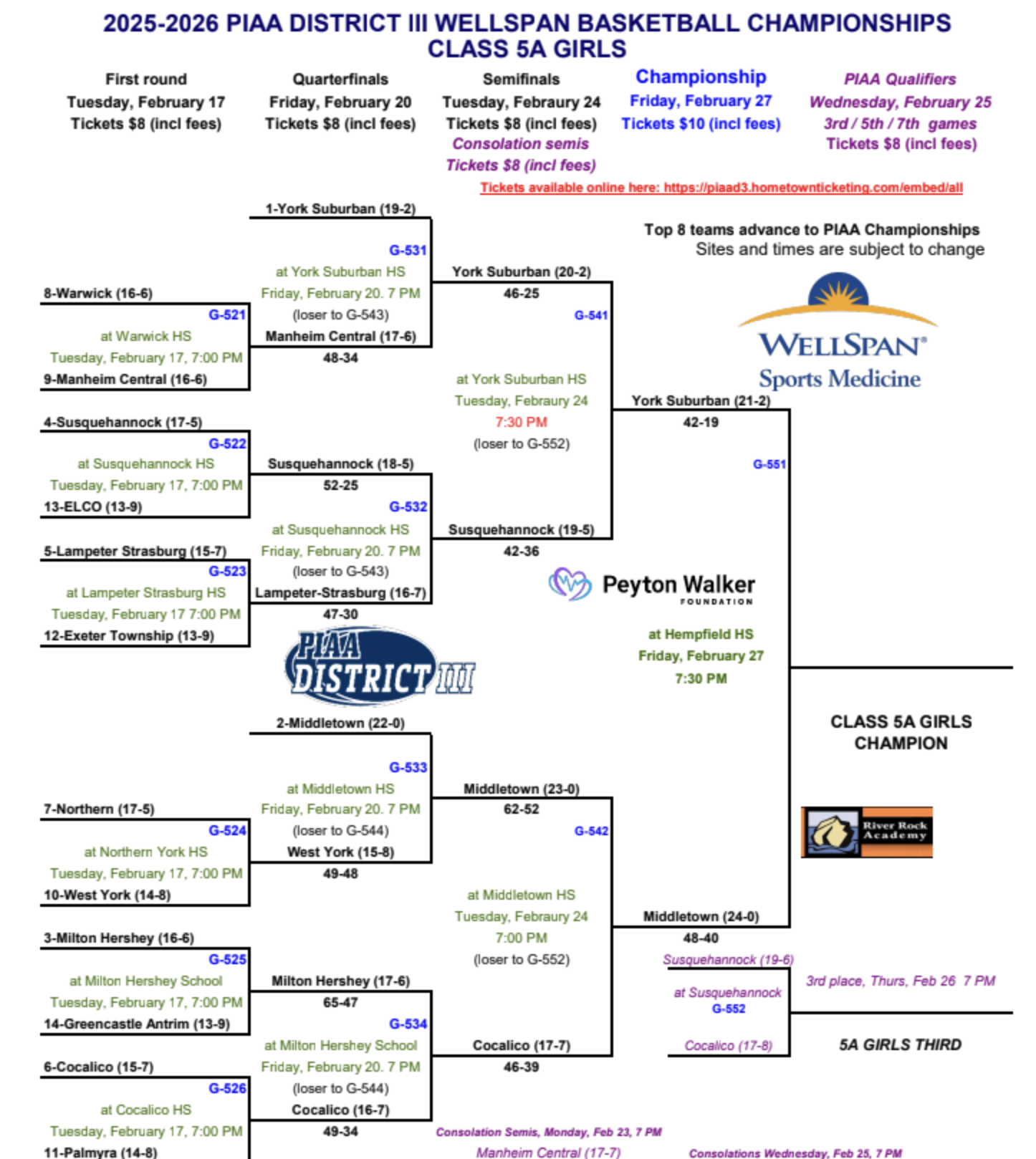 Cocalico will play on Thursday, February 26 in the 5A Girls 3rd place game vs. #4 Susquehannock (which is a rematch of Cocalico’s Tip-Off Tournament Final back on December 6 when the Lady Eagles needed OT to Win 45-36).