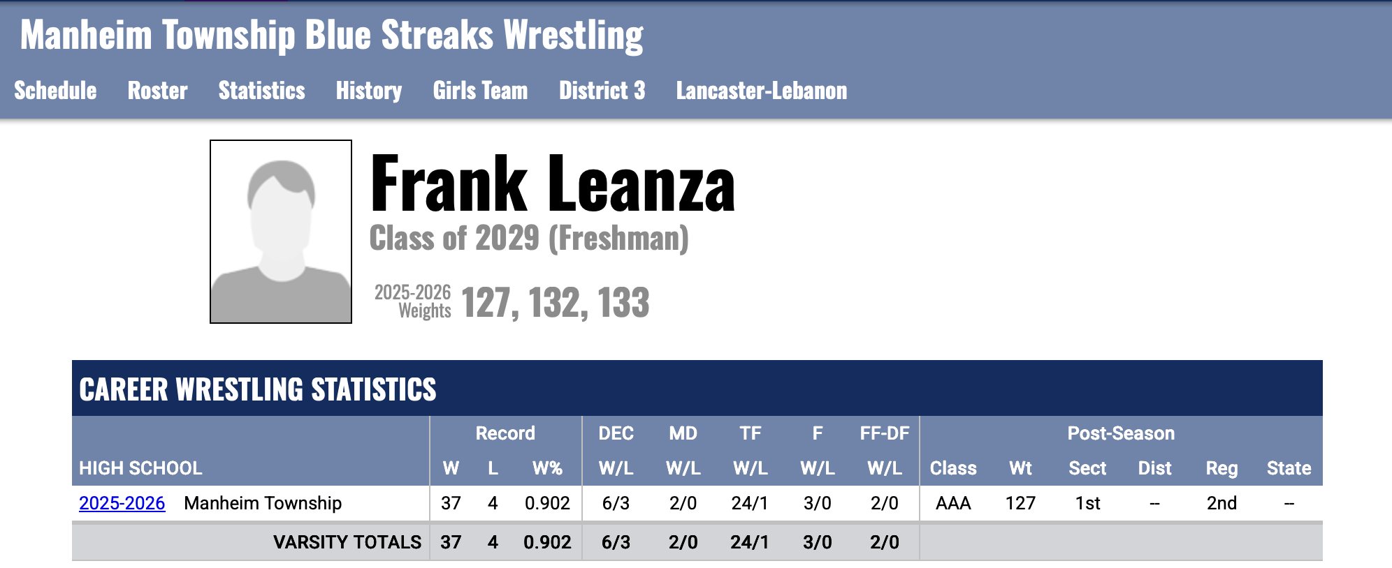 Manheim Township’s freshman Frank Leanza placed 4th in the 127 pound category.