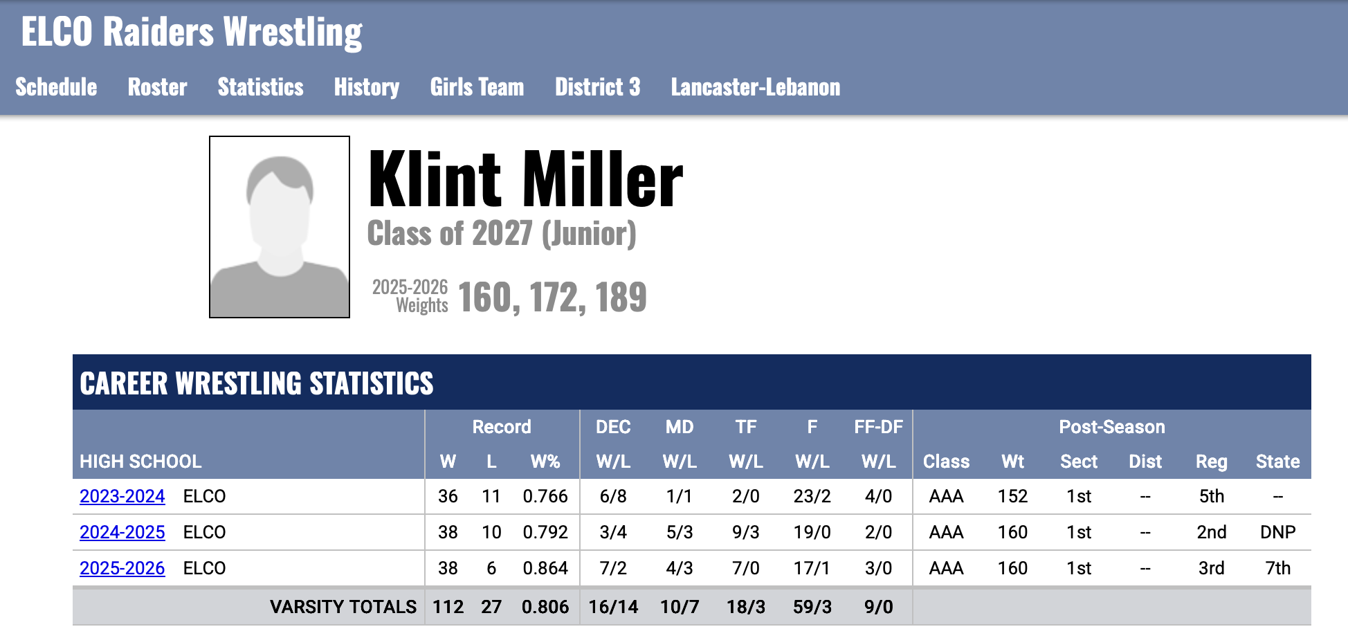 Elco’s Klint Miller a junior career, took home a seventh place in the 160 pound category.