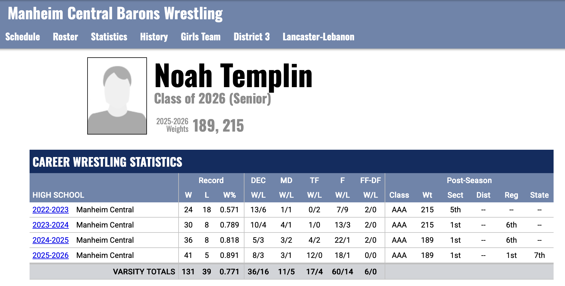 Manheim Central’s Noah Templin, a senior placed seventh in the 189 pound category for his first medal. He finished his high school career with 131 victories.