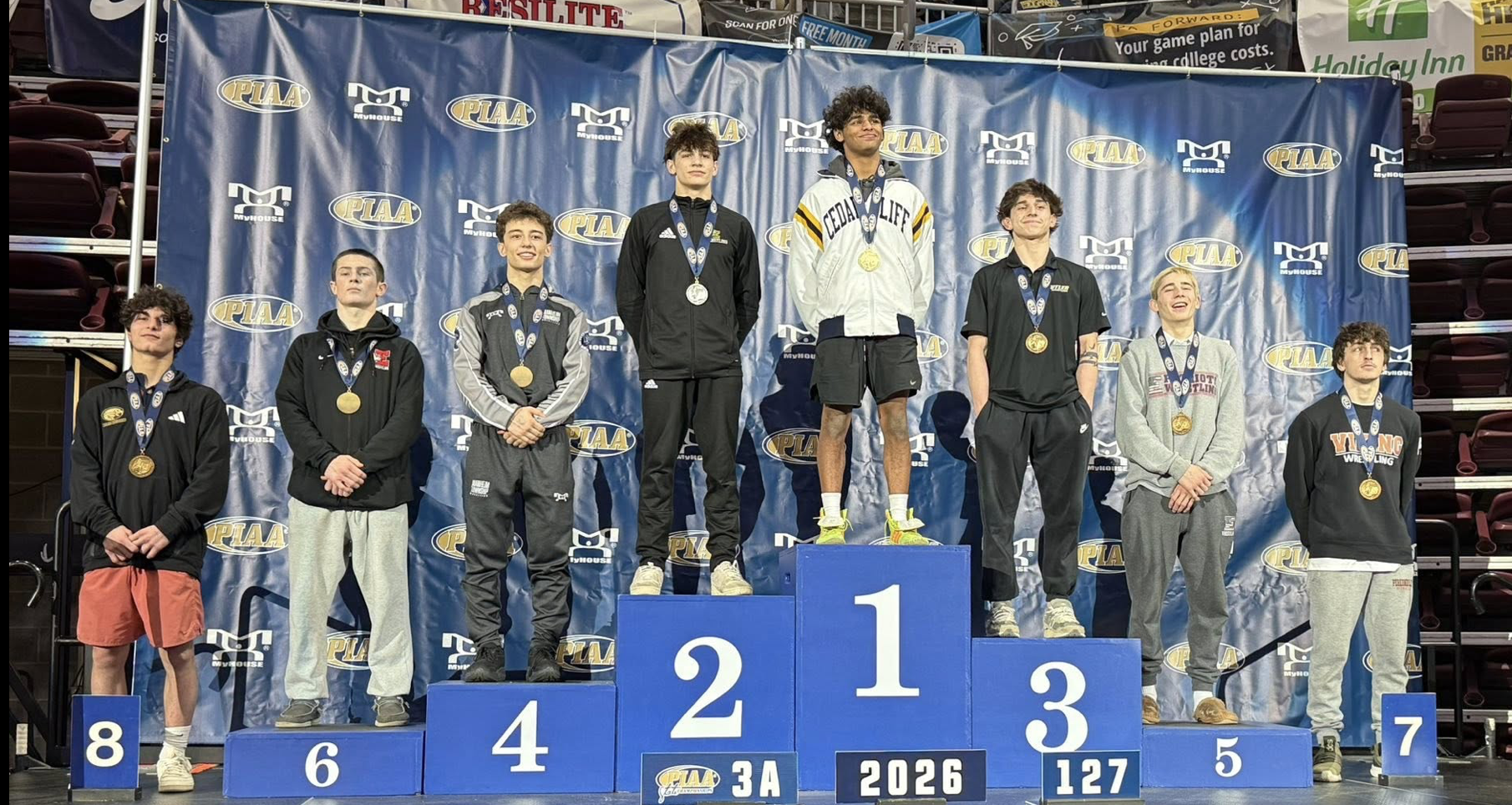 Here he is standing with other wresting medal winners for the 127 LBS class: