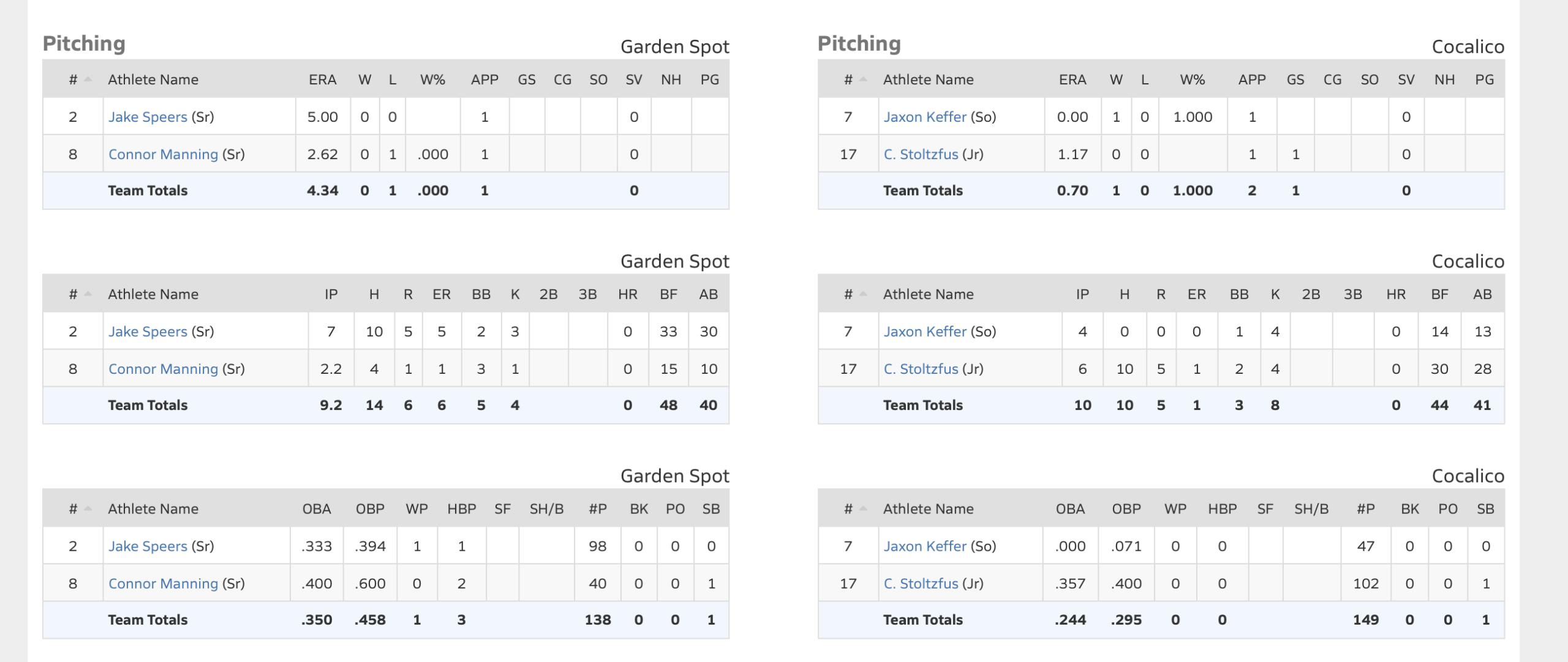 Colten Stoltzfus made a splash no matter where he played. He pitched six innings while giving up just one earned (and four unearned) runs off ten hits. He has been consistent: he hasn’t given up more than one earned run in seven consecutive appearances. He was also solid in the batter’s box, going 2-for-5 with two RBI and one run.